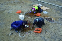 草津市の黒土遺跡の調査の結果、縄文時代の河道や奈良時代から平安時代にかけての掘立柱建物・金属製品生産関連遺構がみつかりました。とりわけ、平成28年度調査でみつかった長舎建物の一部をはじめ、金属製品鋳造に伴う炉壁や木炭が多く出土したことは注目されます。