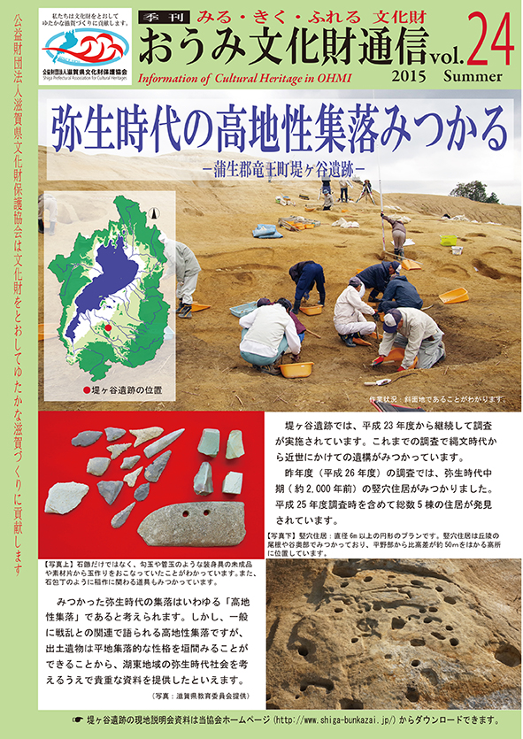 刊行物 TOP › 刊行物 › おうみ文化財通信 › おうみ文化財通信 vol.24 2015 Summer おうみ文化財通信 vol.24 2015 Summer 平成27年7月1日刊行 ・【調査速報】 蒲生郡竜王町堤ヶ谷遺跡 高地性集落みつかる ・【イベント情報】 あの遺跡今!Part21 ・【講座案内】 滋賀の文化財講座『打出のコヅチ』 ・【刊行物】 紀要第28号刊行 ・【イベント情報】 レトロ・レトロの展覧会2015 ・【体験学習案内】 夏休みの考古学体験学習