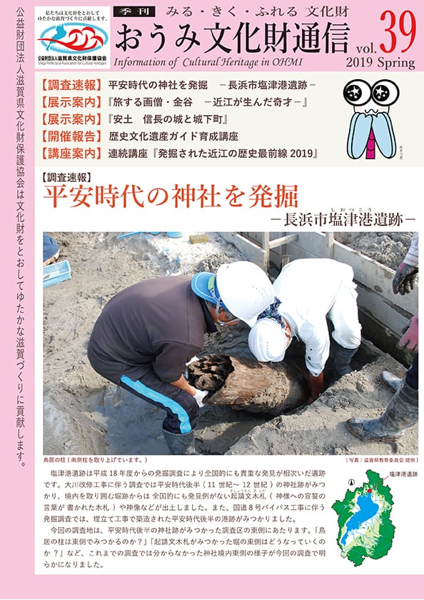刊行物 TOP › 刊行物 › おうみ文化財通信 › おうみ文化財通信 vol.39 2019 Spring おうみ文化財通信 vol.39 2019 Spring 平成31年4月1日刊行 【調査速報】平安時代の神社を発掘-長浜市塩津港遺跡- 【展示案内】『旅する画僧・金谷-近江が生んだ奇才-』 【展示案内】『安土 信長の城と城下町』 【開催報告】歴史文化遺産ガイド育成講座 【講座案内】連続講座『発掘された近江の歴史最前線2019』
