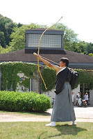 滋賀県弓道連盟の野玉隆文先生の鏑(かぶら)矢の発射を合図に、約20m離れた敵陣地に攻め込み、敵の盾にとりつけられた風船をすべて割ったら終了です。
