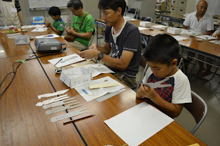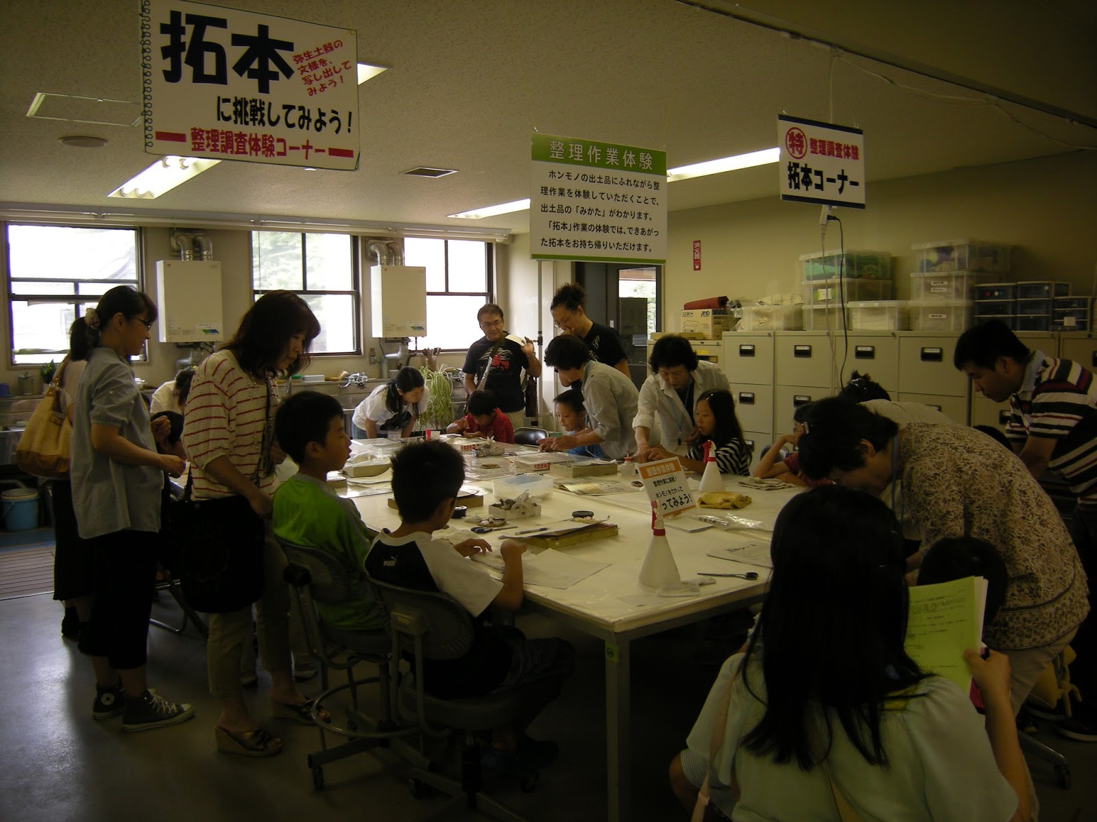 を開催しました。参議院選挙の投票日にあたり、出足を心配していましたが、延べ354名の方にご参加いただきました。夏休み最初の日曜日ということもあり、親子・家族でのご来場が多くありました。17日の夕方のテレビや18日の新聞に大きく取り上げられた高島市上御殿遺跡出土の人形代(ひとかたしろ)・馬形代(うまかたしろ)をモデルにした「古代のおまじないグッズをつくろう」には、博物館の開館前から順番待ちの列ができました。また、パウチ・シートにしてお持ち帰りいただいた拓本体験やホンモノの土器を使った接合体験は、お子さんだけでなく、大人の方にも大人気でした。子供から大人までという点では、全問正解者へのちょっとしたプレゼントもあり、クイズラリーも大人気。