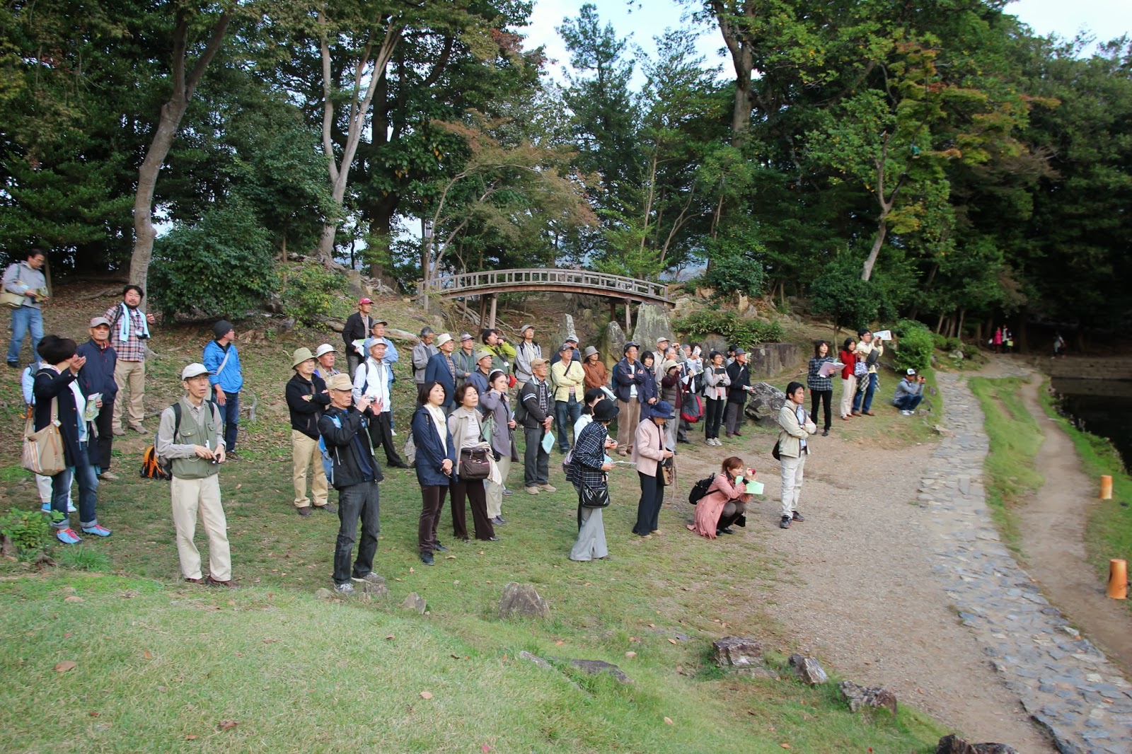 津市南郷に洗堰ができてから下がった現在の水面高になった東側ということでした。続いて、名勝楽々園へ。ここで彦根市教育委員会の北川さんにも合流いただき、2班に分かれました。A班は特別に書院の中に入れていただいて北川さんから説明を、B班は三尾さんから庭の説明を、それぞれしていただき、その後交代しました。楽々園では平成19年に発掘調査が行われていて、その成果についてのお話しがありました。続いて名勝玄宮園へ。こちらも平成22年以降調査が行われていて、その成果を基に整備されています。ただ、玄宮園に入った段階で、当初終了を予定していた4時超え。たくさんのネタを用意していただいていたのですが、少し急ぎ足で庭園を見て回り、4時半に出口へ。詳しい資料も用意していただき、参加者の皆さんも満足そうでしたが、さすがに3時間半近く歩きまわったので、お疲れの方もいらっしゃいましたようです。