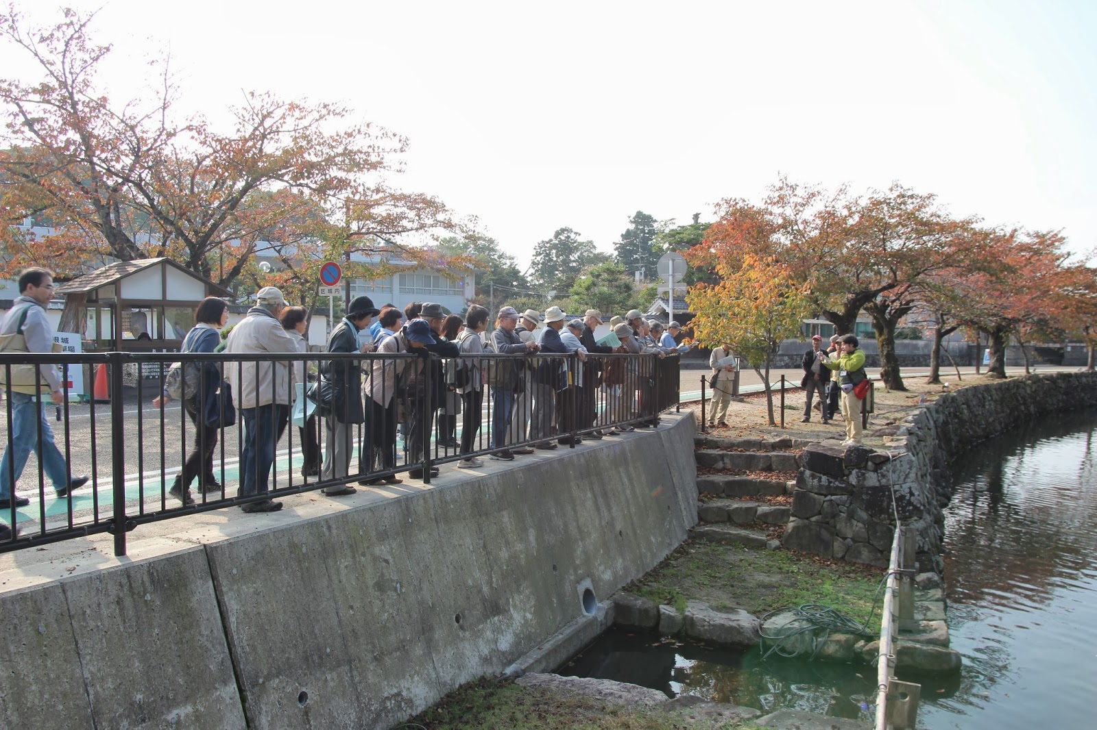 秋晴れの彦根城を舞台に、連続講座受講者を対象にした探訪ウォークを実施したところ、41名の方々に参加いただきました。今回は彦根城の整備をおもに担当しておられる彦根市教育委員会の三尾さんをゲストスピーカーに迎え、「探求!彦根城調査の新成果」と題して、案内していただきました。最新の調査成果や専門家ならではの視点からみた彦根城の解説を目的としましたので、彦根城博物館の見学どころか国宝の天守にものぼらない、極めて「マニアック」な探訪ウォークとなりました。
