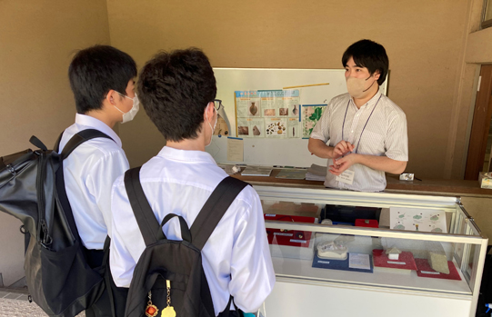 私たちがお手伝いしたのは、人間文化学部の地域文化学科さん。学生さんたちが、「勾玉づくり」体験で、見学に来た高校生に文化財の魅力をアピールする横で、私たちは県内出土のアクセサリー類の身に展示を展開。高校生とその保護者のみなさんに親しんでいただけました。