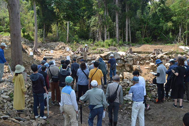 説明会にご参加いただいた皆さんには、発掘現場まで麓から少々山道を登っていただき、現場で見つかった道路遺構を間近に見ていただきながら、調査員による解説を聞いていただきました。さらに出土した遺物についても、調査員が詳しく説明いたしました。現地説明会にご参加いただいた皆様には本当に感謝です。