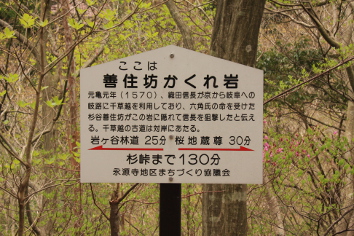 千草越えは、愛知川の支流の渋川の谷に沿って登りますが、車止めから1時間ほど登ったところに、善住坊の隠れ岩を示す道標があります。これに従って谷に下ると左岸に頭の平らな巨巌があります。これが隠れ岩です。信長の時代、千草越えは渋川の右岸を通っていました。善住坊はこの岩の上に身を伏せて、対岸を行く信長を撃ったのです。しかし、「されども、天道昭覽にて、御身に少しづつ打ちかすり、鰐の口を御遁れ候て、」と、信長にとっては運良く、銃弾は外れます。川の対岸から狙撃されたことと、信長は一刻も早く近江を離れたかったことから、おそらく善住坊に対する追撃は甘く、彼は遁走し、暫く高島に身を隠すことになります。