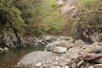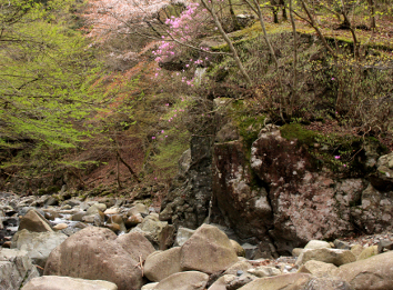 渋川の谷。右端の黒っぽい大きな岩が隠れ岩