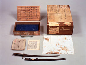 なお、滋賀県立琵琶湖文化館では、この大津事件の関係資料(写真2)を収蔵しています。写真の中では、津田三蔵が犯行に使用したサーベルやニコライの傷の応急処置に使用した血染めのハンカチが目を引きますが、実は本資料の大半を占めているのは取調書や事件の報告書、事件後の動向を示す文書などの文書類です。特に、取調書には事件現場の略図(写真3)なども付属していて、生々しい本事件の一部始終を知ることができます。また、供述調書には犯人である津田本人の供述が記されており、事件の真相にせまるうえでとても重要な資料です。