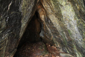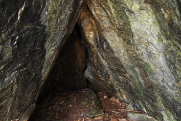 朽木谷を流れる安曇川の支流北川に朽木街道がぶつかるところの右岸に面白い伝承を持つ場所があります。「信長の隠れ岩」と呼ばれる巨巌です(写真1)。累々とした巌が重なり合うところに洞穴状の隙間があり(写真2)、ここ信長は潜み、松永久秀と朽木元綱の交渉の結果を固唾を呑みながら待った、と地元では伝えられています。これが本当の事かどうかは判りませんが、位置といい、その雰囲気といい、信長が潜んだという伝承が生まれても決しておかしくない所です。