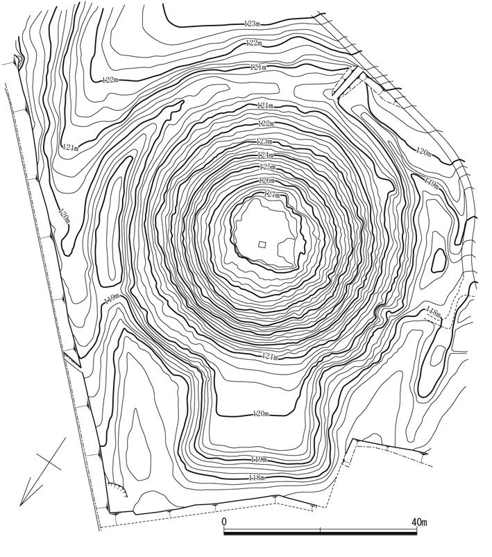 後円部では墳丘の途中にテラス状の平坦面がまわり,それを境にして上下二段に墳丘が構築されるという墳丘の構造(二段築成)を視覚的に理解できます(写真1)。また,斜面と平坦面を実際に歩いてみることで,実体験としても段築を理解できるのです。さらに,前方部(写真2)が後円部にくらべて低く,その上面が段築のテラス面に相当することもわかります。後円部の頂上にのぼると,広い円形の空間がひろがっています。その中心には古墳の被葬者が眠っているはずです。前方部を振り返ると,前方部頂上の空間を望めます。