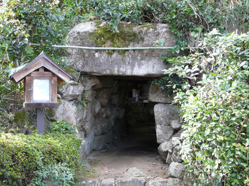 その一つに通称、桐畑古墳(熊ヶ谷1号墳)があります。10基が確認されている熊ヶ谷古墳群中の1基です。桐畑古墳は、古墳群内で最も規模の大きな石室を持ち、玄室の長さ5m、幅3.1m、高さ3.6m以上、羨道が長さ6m、幅1.4m、高さ1.6mを測ります。玄室の天井石はありませんが、玄室の中央に立って上を見上げると、四壁(奥壁・左右側壁・前壁)が天井部に向かってすぼまっている様子がわかります。このように四壁を天井に向かってすぼませる構造を持ち送り構造といいます。この持ち送り構造を持ち、天井を1~2石で構成する形態がみられるのが、この比叡山東麓に広がる古墳群の石室の特徴です。また、玄室の奥にはお不動さんが祀ってあり、現在でも信仰の対象となっています。