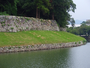 彦根城の表門近くの内堀沿いに見られる[石垣]―[土塁]―[石垣]という3層構造は鉢巻腰巻石垣といい、ごく一部の城(江戸城や会津若松城の一部)にだけ見られる特殊な積み方です。これは高い石垣を積むことが出来ない土地で、間に芝土居を挟むことで石垣全体の重量を軽くし、地盤への負担を軽くする効果があると言われています。