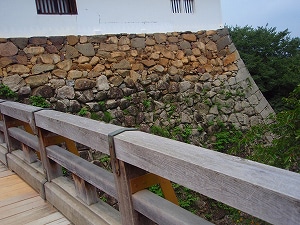 天秤櫓は第92回でも取上げられていますが、今回はその石垣に注目してみましょう。よく見ると、この石垣は左右で積み方が異なっています。天秤櫓にかかる橋から見て右側(東側)が築城当時の石垣で、大きな石の間に小さな石を組み合わせて積み上げるごぼう積みという工法で積まれています。一方、左側(西側)は幕末の改修で積み直された石垣で、同じような大きさの石を隙間が出来ないように整然と積み上げる落し積みという工法で積まれています。これだけの高さの石垣を半分だけ改修するという大工事に思いを馳せてみてください。