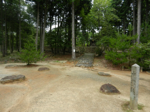丘陵の最南端には中門跡があり、さらに進むと一段高い金堂跡があります。金堂跡と中門跡の比高差は約4mあり、往時は中門をくぐると、その前に金堂がそびえ立つ風景だったと想像されます。金堂跡の基壇部分は東西約28m・南北約18mで、礎石の並び方から基壇上には桁行7間・梁間4間の建物が建っていたと考えられます。この金堂の規模では、到底大仏を納めることは不可能です。金堂跡の北側にはさらに平坦地が広がっているので、こちらで大仏が造営されたのではないか、とする意見もあります。なお、現在は金堂跡の中央に聖武天皇を祭神とする小祠堂があります。