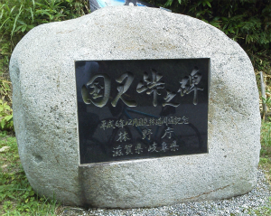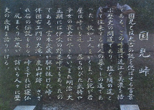 江戸時代中期に膳所藩士寒川辰清(さむかわとききよ)がまとめた本格的な地誌『近江輿地志略』には、美濃路として「長競越(たけくらべごえ)」・「藤川越」・「大久保越」・「加賀川嶺越(かすがわとうげごえ)」・「久加越」・「中尾嶺越」・「島津越」の7道が記載されていますが、「国見越(国見峠)」は見あたりません。しかし、「大久保越」は「大久保村より美濃国種本村へ出づる路也。大久保村より國界へ半里、國界より種本村へ一里歩行難路也。」となっています。すなわち、大久保は板並の下流側の集落ですからここを起点としていることと、種本村の地名は現在には残っていませんが、寛永年間以降明治8年に美束村の一部となるまではかつて独立村が美束の地にあったことをあわせると、この「大久保越」が国見峠を経て美濃国へと至る経路であることがわかります。この記載の通り、江戸時代でも歩くのにも困難な経路で、近江国ではあるいはさほど重要視されていなかった経路だったのでしょう。一方、美濃国としては塩と絹の道として重要視されていたことが、峠に設置された石碑の碑文から知ることができます。現在では国見峠林道として舗装されていますが、滋賀県側では斜面の小さな崩れによる転石や砂が所々濡れた路面を覆っているのに対して、岐阜県側にそのような箇所はほとんどありませんでした。このことも峠道に対する意識の差を示しているような気がします。