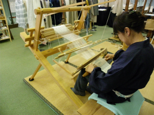 2階には昔ながらの手織りを再現できる機織機(はたおりき)が何台もあり、日によっては職人さんによる機織りの実演なども見学できます。機織りや苧績み(おうみ:繊維を糸にする作業を麻の場合は「績む(うむ)」と言います)体験もやっていて、手軽にできる半日コースから糸を手で績むところから始める長期コースまで、いろいろ選ぶことができます。また、季節やイベントで本物の藍染めや草木染めなどをやっていることもありますし、あるいは年に一度、麻の収穫時期にという苧麻(ちょま)から糸にする繊維を取り出す「苧挽き(おひき)」という作業を体験することもできます。これは全国で2ヶ所しかやっていないとても貴重な体験です。近江の伝統産業や布製品に興味のある人なら、とても楽しめるところです。