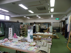 「伝統産業会館」なんていうと堅苦しい感じですが、全然そんなことはありません。入ってすぐのフロアはショップになっていて、麻素材を中心とした衣類やストール・手ぬぐい・布巾などの各種布小物、また無地や柄物の生地も扱っています。“麻”と一口に言っても、リネンやラミーなど種類がありますが、ここは各種置かれています。また、草木染め・本藍染めのものや布製品以外に天然素材だけで作った石けんなどもあり、こだわりのモノを探している人にはなかなか楽しいお店です。それから、いわゆる伝統工芸品としての「近江上布」についても、現物資料や関連書籍などが置いてあります。