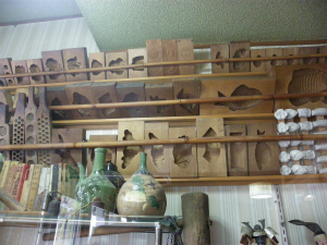 すぐ近くには中山道65番目の宿場町「愛知川宿」があります。国の登録有形文化財になっている、宝暦8年(1758)創業の旅籠の建物があったり(明治天皇が休憩された所だそうで、現在は「竹平楼」という料亭になっています)、昔ながらのたたずまいのお店などが多くあったりして、なんとなく古い町並みの雰囲気を楽しめます。また、旧街道沿いにはわずか100mほどの間に和菓子屋や餅屋が3軒もあって、ついハシゴしてしまいます。なかでも創業が慶応元年(1865)の『しろ平老舗』さんの店内ショウケースには、創業以来の古い菓子の木型などが盛りだくさんに展示してあって面白いです。お菓子も愛知川にちなんだものが色々あって目移りしてしまいますよ。気候のいい時期は宿場町をたどり中山道をてくてく行くのもよいかもしれません。