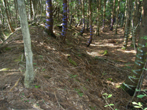 田屋城は高島市マキノ町森西にある、標高約310mの「城山」と呼ばれる丘陵上に築かれた山城で、在地土豪の「海津衆」の一人である田屋氏の城とされています。城への登山道へは動物除けの柵を開けて入らなければなりませんが、道中に分かれ道などはなく、城跡まで迷わず進んでいくことができます。曲がりくねった道をひたすら歩き、最後に急な坂道を登り切れば、土塁で囲まれた6か所の曲輪で構成される城内に到着します。ただし、訪れやすい山ではあるものの、日当たりの良い場所では草木が生い茂っている場合がありますので、現地を訪れるのは秋から雪が降るまでの晩秋か、雪が溶けた春先がおすすめです。