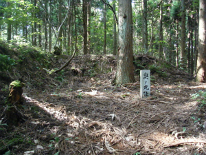 動物除けの柵を通過して登山道に入るとすぐに、稲山隧道への案内板があります。この案内板を右に曲がれば田屋城へ、直進すれば稲山隧道に行くことができます。稲山隧道は、森西集落の水田水利のために掘られたトンネルで、明治28年(1895)に着工し、明治33年に完成しました。総延長300mもあり、当時の工事の苦労が偲ばれますが、そのおかげもあって現在でも森西の水田を潤しています。