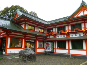 また、日本の時刻制度の始まりが、天智天皇が大津宮に漏刻(水時計)を造って時刻を知らせたという由縁から、境内には漏刻の復元模型や時計館宝物館が併設されています。時計館1階には、アンティークの素敵な腕時計や、探偵を気取りたくなるような懐中時計、お婆ちゃん宅にあった懐かしい和時計など、古今東西の珍しい時計がずらりと展示されています。どちらかと言えば男性が夢中になりそうな・・・。また2階の宝物館には、日本を代表する画人である曽我蕭白が描いた「楼閣山水図屏風」(重要文化財)の複製や、方相氏(ほうそうし:昔の宮中の儀式で悪鬼を追い払った役)の面など、近江神宮所蔵の貴重な文化財を見ることができます。そう、どちらかと言えばご年配の方が興味そそられる逸品が・・・。そして2階展示室の一画では、今だけ、平成25年1月6日までの間だけ、「ちはやふる 複製原画展」が開催されています! 漫画を読んだことのある人なら「あっ、あのシーン!」と思わず前後のストーリーまで思い出せる色鮮やかな世界が、お子さまやそのお母さま、はたまた若い女性達を魅了しています。家族で参拝した後や、デートの行き先として、誰もが飽きずに喧嘩せずに見て回れて満足できる、貴重なお出かけスポットと言えるかも・・・。漫画とコラボできるのも、近江神宮ならでは?! 斬新な取り組みが素敵です。
