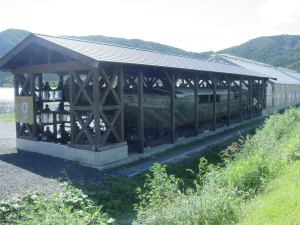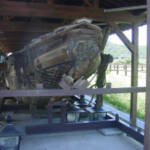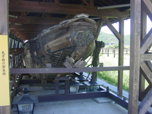 なぜ、道の駅をここで紹介するのか? その答えは、道の駅の建物の背後にひっそりと建つ倉庫にあります。ここには、丸子船の実物が展示されているのです。丸子船は、江戸時代を中心に戦前まで琵琶湖の湖上運送の主役を担った、琵琶湖独特の帆走木造船(戦後はエンジン船)です。喫水が浅く、舷側にオモギという杉の丸太を半栽したものを取り付けていたり、舳先をヘイタとダテカスガイで作っていたり、独特な構造を持っています。