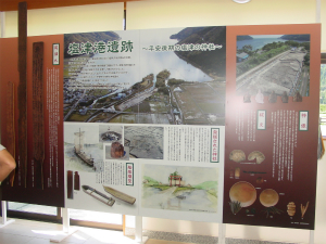 「塩津海道あぢかまの里」のすぐ近くには、塩津港遺跡があります。平成18年度から始まった発掘調査で、神社遺構や多数の木簡・神像などが発見されるなど、たくさんの調査成果がありました。発掘現場そのものはご覧いただけませんが、発掘成果は、「塩津海道あぢかまの里」にある「道の駅情報館」内でパネルで紹介されています。