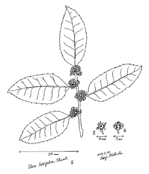 オガタマノキ、サカキ、クスノキ、ユズリハ、ナギなど神社の社叢に特異的に見られる樹木はそれぞれに歴史的な植栽の理由があるようです。モチノキ科モチノキ属のタラヨウ( 学名は Ilex latifolia Thunb. で、種小名のlatifolia は広葉という意味。 漢字では多羅葉の字をあて、常緑高木で、本州関東以西~九州、中国に分布します。)もやはり多くは神社仏閣に見られます。