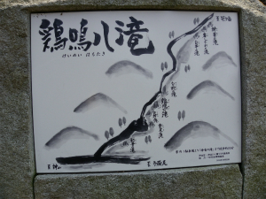 国道422号を甲賀市信楽町から伊賀方面へ向かう途中、神山(こうやま)の交差点で右折して大戸川沿いに県道多羅尾神山線を多羅尾方面へ進み、大戸川に神有川が合流する三叉路で左折して神有川に沿って遡ると、見事な滝にたどり着きます。これが鶏鳴の滝です。