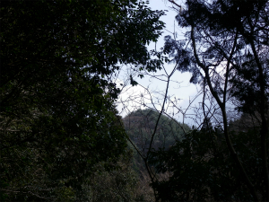 滝壺手前にある「鶏鳴八滝」の看板には、この谷筋にある滝の位置を示したごく簡単な地図があります。それによると、この滝の上流にもいくつか滝があって、さらに登っていくと笹ヶ岳山頂に行けるようです。しかし、かなり急峻なため、私はここから登ったことはなく、あまりおすすめはできません。笹ヶ岳山頂へ登るには、神山の交差点からもう少し伊賀方面へ進んだところにある南新田のバス停から、さらに、少し東へ行ったところにある登り口の方が、安全で登りやすいです。気軽に登れる山なので、気候の良い時期に登ってみるのもよいでしょう。笹ユリの自生地ですから、6月ころには花が見られるのでしょう。山頂では大きな信楽焼の狸が出迎えてくれ、ここからの見晴らしはなかなかのものです。頂上から南にやや下がりつつ進むと、三重県側を見晴らせる絶景ポイントもあります。