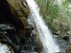 鶏鳴の滝の脇にはお不動さんの石像があり、滝の上方にも小さな祠があってお不動さんが祀られています。滝壺付近はとても水しぶきがかかります。夏は気持ち良いですが、冬は凍りついていて滑るので、十分気を付けてください。