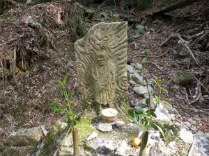 鶏鳴の滝は高さ13m・幅11mの堂々たる滝で、しぶきが凍ってつららが下がるような冬場でもかなりの水量があります。鶏鳴の滝という呼称は、この滝の東方にそびえる信楽の最高峰、笹ヶ岳(標高738.8m)山頂付近にある古い寺跡の閼伽池から、元旦の朝に黄金の鶏が現れて新年の幸を告げるという伝説にちなんでいます。その寺跡は、薬師如来を本尊としていて、仏様にお供えする水を汲んだという石積みの古井戸が今も水をたたえています。大正期頃までは、日照りが続いて田んぼの水が不足すると、この山の上で火を焚き、この井戸をかきまわして雨乞いをした、という話もあります。神有川添いの道を遡りながら前方を仰ぐと、時折木々の間から笹ヶ岳の山頂付近がきれいな形を見せ、この山が信仰の対象であることが感じられます。
