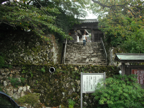 金剛輪寺は湖東三山の真ん中のお寺です。天平13年(741)に行基が創建したと伝えられ、平安時代に円仁が天台密教道場として再興したといわれています。国宝の本堂には多くの仏像が安置されています。このほど、重要文化財である三重塔の檜皮葺き替え工事が完了し、さらに、名勝明壽院庭園の整備も進められています。金剛輪寺も織田信長の焼き討ちで被害を受けていますが、西明寺と同じように寺僧(住職ともいわれている)の機転で本堂と三重塔の焼失を免れています。総門を入るとすぐに愛荘町立歴史文化博物館があり、そこから長い石段を上部に向かうと、石段の両側に多くの坊跡がならび本堂に至ります。金剛輪寺の紅葉は特に色が濃く、「血染めの紅葉」と呼ばれ、真っ赤に燃えます。また、春から夏には石楠花や紫陽花が見頃を迎え、四季折々の風情が心を癒してくれます。