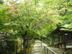 西明寺:苔むした緑の石垣と紅葉を待つもみじの参道