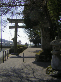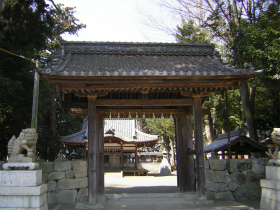 現在の神門は切妻造りの桟瓦葺で、扉は失われていますが、大きさは桁行3.64m・梁間2.99mと、四脚門としては平均的な大きさです。しかし、軒の高さは約4mと、通常よりかなり背が高いです。この神門の前には、明神池の説明で取り上げた四分四分二分を表す際目(さいめ:土地の境界)石が敷かれています。四分四分二分の考えは、千僧供・岩倉・馬淵の3集落の安定と繁栄を祈念した共同の祭礼として、現在でも毎年5月に馬淵郷の祭礼として馬見岡神社で行われています。