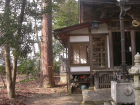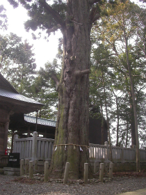 春日神社のスギについて、とくに印象に残ったことがある。それは、社殿右側にそびえるこの大きなスギに対して、左側に幹まわり2m、推定樹齢30年に満たないスギが立っているのである。この左側のスギは、この神社を守っている人たちが、将来大スギにかわるスギとして準備しているものである。この小さいほうのスギには、大スギと同様に注連縄が張られ、将来御神木の役目を受け継ぐ用意がされている。このことは、世代を超えて大木に託す、地元の人々の信仰心の深さのあらわれであると感じられた。