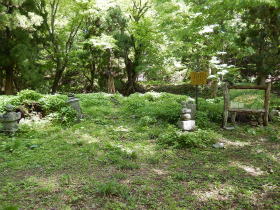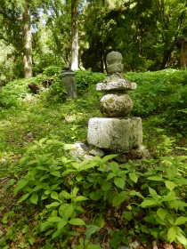 周辺にはいくつかの平地も現れ、寺跡が近いことをうかがわせます。緩い下り坂を過ぎると湿地帯が現れます。ここはかつての庭園跡で、片隅にその名が寺院の塔の九輪に由来するクリンソウがひっそりと咲いている姿は廃寺の庭園跡にふさわしい光景です。庭園跡を左手にみて進むと、一段高い平坦面に出ます。山裾に広がる平地には崩れかけた宝篋印塔や五輪塔、石柱が佇み、いくつかの礎石や基壇跡がみられます。平坦面の一段高い場所に9m四方ほどの本堂跡とみられる基壇があります。江戸時代の権現堂跡でしょう。20か所近い平坦面には所々に礎石や基壇がありますが、夏草に覆われ、中世の鶏足寺跡の栄華が偲ばれます。この地にあの十一面観音菩薩像があったと想うと感慨深いものがあります。山里から遠く離れた山中にひっそり佇む廃寺跡は、いにしえの山岳信仰の隆盛を彷彿とさせます。(神社から廃寺跡まで往復約4時間、健脚向)