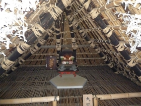 通常、お寺の屋根裏に上がる機会はありませんし、開放しているところもあまり聞いたことがありません。ここ教林坊では書院の屋根裏を見ることができます。決して広くはありませんが、ヨシ葺きということもあり独特の雰囲気があります。そして、大黒さんが祀られており、訪れた人が結んだのであろうおみくじが一面にあります。この何とも言えない雰囲気をぜひ味わってみてください。