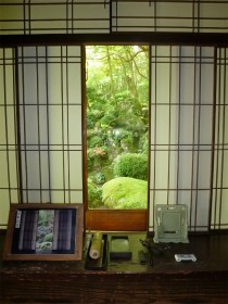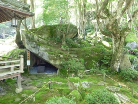 山の斜面を利用して庭がつくられており、散策路は斜面上方から庭全体を眺めながら、本堂、書院へと戻ってきます。本堂脇には、白洲さんが「古墳」と表現した「太子の説法岩」と「霊窟」を見ることができます。書院の座敷の脇には水琴窟があって、周りが非常に静かで澄み切った音色を聴くことができます。書院は江戸時代前期のヨシ葺きの建物です。庭園を見るのはやはり座敷から眺めるのが一番ですが、その中でも障子を掛け軸幅で開け放って眺める「掛け軸庭園」は趣があってぜひ見ておきたいものです。