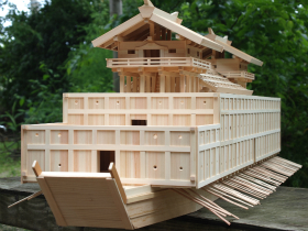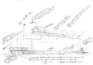 かつて松原内湖には大きな丸子船も出入りしていた様子がわかりましたが、丸子船サイズで驚いていてはいけません。戦国時代に織田信長は巨大な軍艦を造ったのです。長さ54m・幅14mと当時、日本いや世界を見回しても一番大きな船をこの松原内湖で造ったのです。コロンブスが大西洋を渡ったサンタ・マリア号でさえ長さ18mです。信長の軍艦がいかに大きかったかがわかるでしょう。残念ながら、この船については、文献に見られるだけで、絵画資料がなく、具体的な姿はわかっていません。しかし、近年、安土城考古博物館が復元を試み、模型を制作しました。琵琶湖ならではの浅い水深に対応した船底構造、40日足らずという短い製作期間、派手好きな信長の好みを考慮したイメージ復元船です。