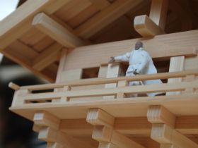 この丸子船、昭和まで琵琶湖で活躍していたのですが、今はもう航行する姿を見ることはできません。その雄姿は古写真などからうかがうだけなのですが、ベストショットの一つに右の写真があります。場所は彦根城の北にかつて存在していた松原内湖のほとりです。石で護岸された船着き場に丸子船が着岸しています。松原内湖は内湖であるため、水深がきわめて浅いのですが、そんな場所に丸子船が横付けされているのです。実は、丸子船とは淡水湖で水深の浅い琵琶湖を自由に航行するための工夫が随所にみることができる船なのです。たとえば、「笠木」と呼ばれる鳥居のようなものが船尾に取り付けられており、浅い場所では邪魔になる舵を引き上げられるようになっています。