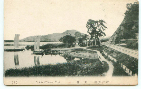 琵琶湖水運の花形である丸子船を消滅に追いやったのは鉄道輸送です。北陸線・東海道線が開通すると、桶の底に穴を開けたかのように琵琶湖水運で運ばれる物資は減っていきました。そんな丸子船と東海道線を走る汽車を同じ場所に見ることのできるショットが左の2枚めの写真です。