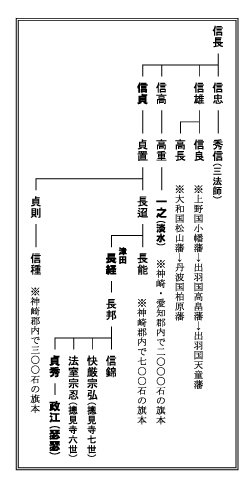 織田信長の血筋は、本能寺の変や関ヶ原の戦いの後も続いており、息子たちの子孫は、江戸時代には大名や旗本となっています。右に示した略系図をご参照下さい。