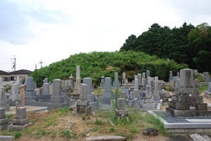 小槻大社にむかって南へ伸びる参道の最初の鳥居の西脇には共同墓地がありますが、この墓地の中に直径約50mの円形の墳丘が残る下戸山古墳があります。周濠の出土品から4世紀末~5世紀初頭の築造と考えられます。本来の墳形をうかがうことはむずしいですが、周囲の地形から前方後円墳の可能性が指摘されています。
