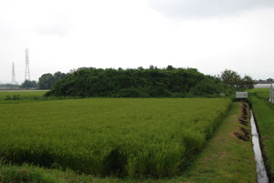 この参道を北へすすみ、名神高速道路と小槻大社お旅所を越えて200mほど前方に見えるのが地山古墳です。田圃のまんなかに浮かぶ地山古墳は耕地整理で方墳のように見えますが、墳長90m、後円部直径68mの帆立貝形前方後円墳で、周濠から出土した埴輪から、築造時期は5世紀前半と考えられます。