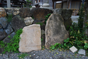 境内の鐘楼の脇に置かれた平たい石材には、よく観察すれば、幅約10㎝程度の浅い溝が「H」字状に彫り窪められています。石材は花崗岩。組み合せ式石棺の底石であることがわかります。通称「尾上の石棺」と呼ばれています。