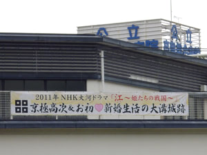 天正15(1587)年、お初は秀吉の命により正室として高次に嫁ぎ、新婚の3年間をここ大溝城で過ごしたといわれています。 大河ドラマ「江~姫たちの戦国」の舞台として盛り上がる滋賀県ですが、ここ大溝城にも「京極」「浅井」両家ののぼりが立ち、近くの公立病院の屋上には、なんともラブらぶな雰囲気の案内板が・・・!・・・「お初ちゃん効果」に沸いています。