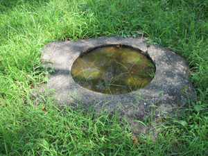 寺院の南東側が公園となっており、遺跡の案内板などが設置されています。公園内には、塔心礎のほか、回廊や僧坊の礎石が残されています。塔心礎は、昭和3年に行われた発掘調査の時に近くの民家から見つかったものが移されています。1.5m×1.8m程度の花崗岩が使用され、平滑にされた一面に直径約83.3㎝、深さ10.6㎝の柱座と、その中央には直径約21.2㎝、深さ約18.2㎝の舎利孔が穿たれています。心礎の大きさから、30m程度の高さがある塔であったと推定されており、壮大な寺院の一端をうかがうことができます。