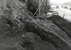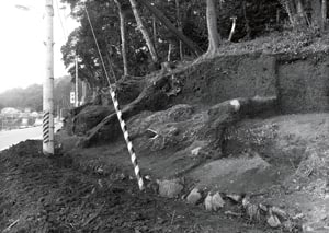 その土器の大半は、実は縄文時代中期の資料です。しかし貝塚そのものは、その後、昭和42年に県道拡幅・歩道敷設工事に伴って実施された発掘調査の結果、縄文時代早期末~前期初頭頃に形成された貝塚であることが確認されています。その結果をもとに、地下に貝塚は保存され、歩道が高くなっていことのは前回、話したとおりです。この調査の記録から、土坑状の落ち込み内に貝層が堆積したような小貝塚が数カ所に分布していたようです。また、貝層に含まれる堆積土壌から、貝塚が形成された当時はその場所が陸域だったことが指摘されています。