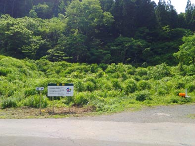 平成27年5月、20年ぶりに自転車仲間と訪れました。ダム堰堤の予定地だった小原集落の手前までは2車線幅の道が整備され、20年前とは全く違う景色となり、「小原」の標示看板がなければ見逃してしまいそうでした(写真2)。家の敷地の石積みなどが残ってはいましたが、樹木は生長し、雑草が生い茂り、自然に帰りつつありました。